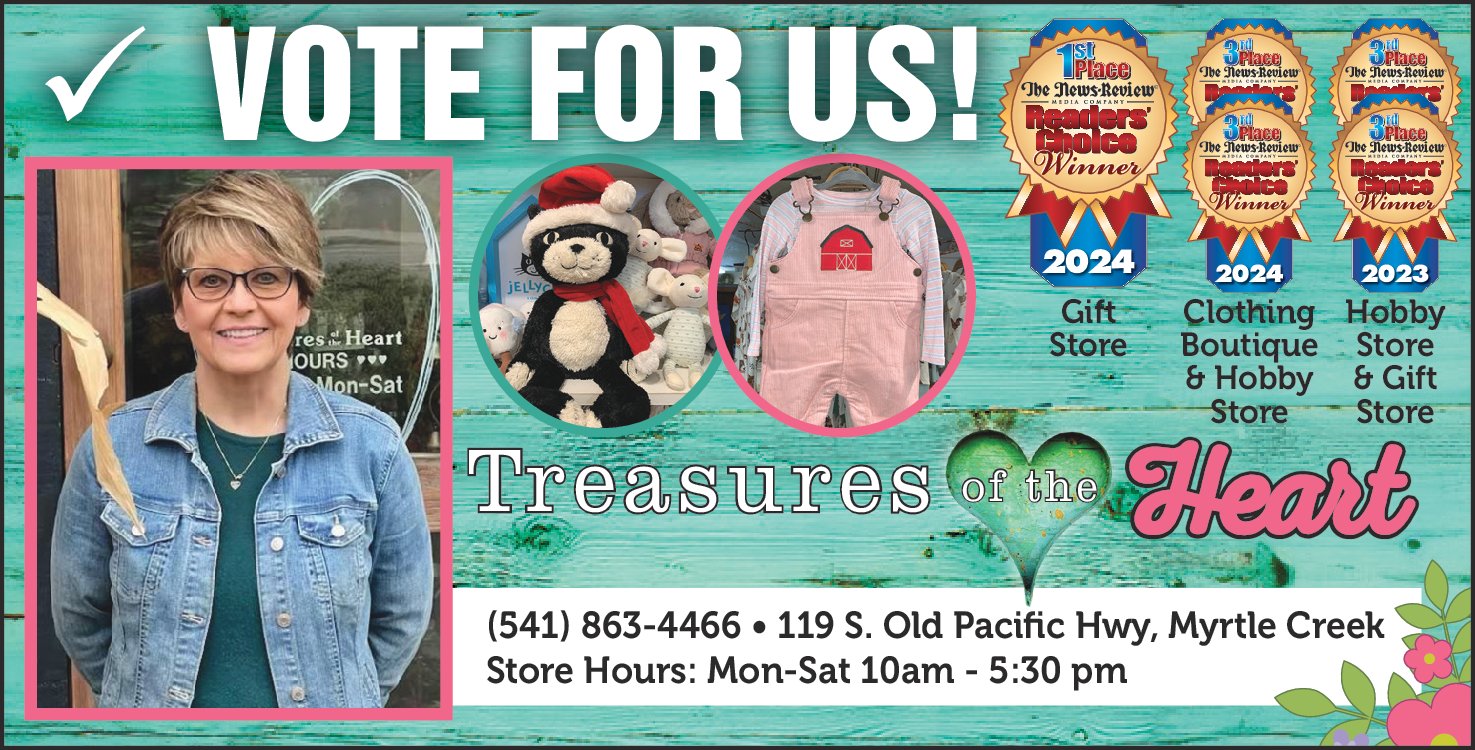 Thank you for voting for Treasures of the Heart We received 1st place Gift Store and 3rd place Clothing Boutique and Hobby Store in the 2024 News Review Reader's Choice Award!
